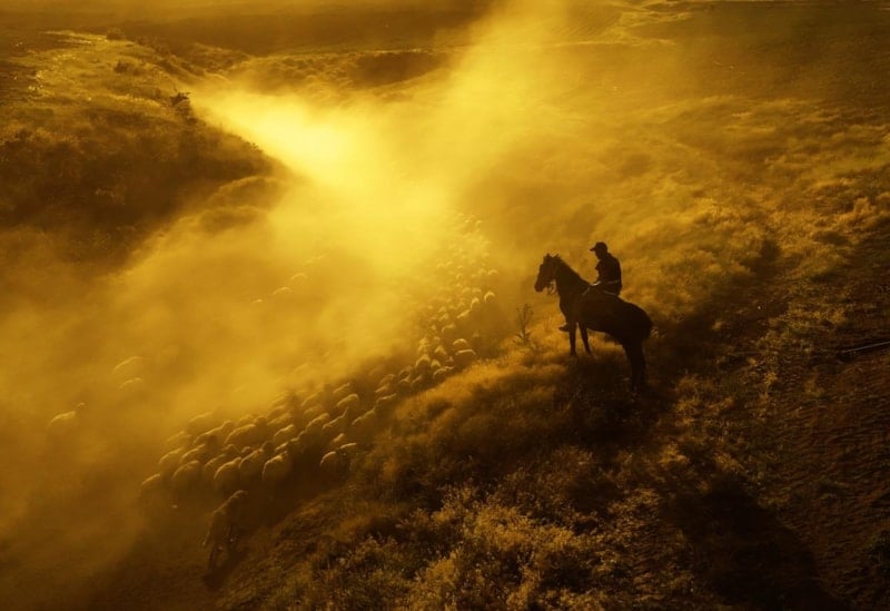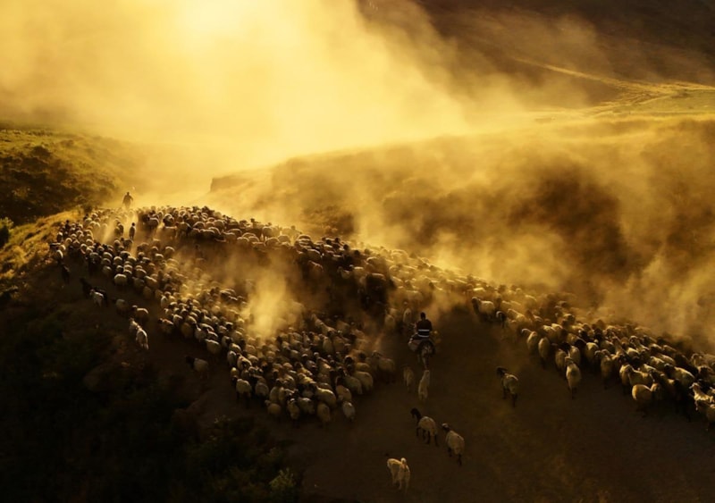 Koyun sürülerinin çıkardığı tozların gün batımı ile birlikte oluşturduğu görüntüler havadan görüntülendi.
