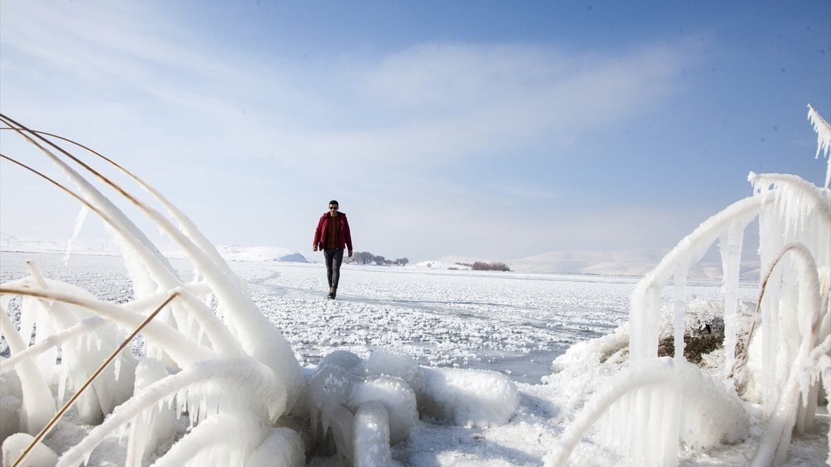 Bitlis’in Ahlat ilçesinde soğuk hava nedeniyle yüzeyi tamamen buz tutan Nazik Gölü’nde güzel görüntüler oluştu.