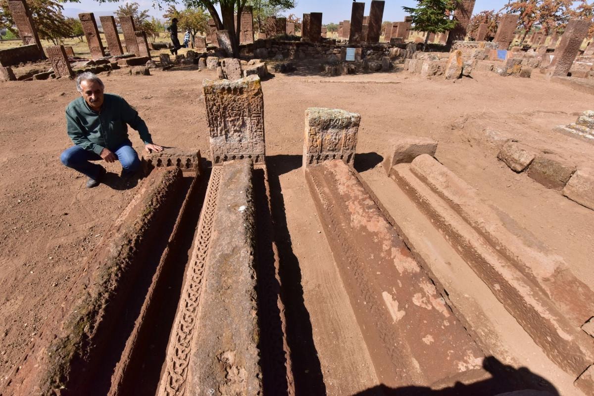 Bu seneki çalışmalarda daha önce söylediğim gibi toprak altında belki binlerce mezar taşı var. Bunların açığa çıkarılması, özgün haline kavuşturulması gerekiyor şeklinde fikir beyan etmiştik ve fikirlerimiz zaten adım adım hayata geçiriliyor. Bu seneki çalışmalarda toprak altından çok nitelikli mezar taşları çıktı. Özellikle 6 tane, sanduka hem yazıları hem süslemeleri ile Selçuklu üslubunu önemli ölçüde yansıtan örnekler. Çünkü hem bitkisel hem geometrik süslemeler hem yazı karakteri tamamen Selçuklu dönemini aksettiriyor. O nedenle bu mezar taşlarını fazla önemsiyoruz.