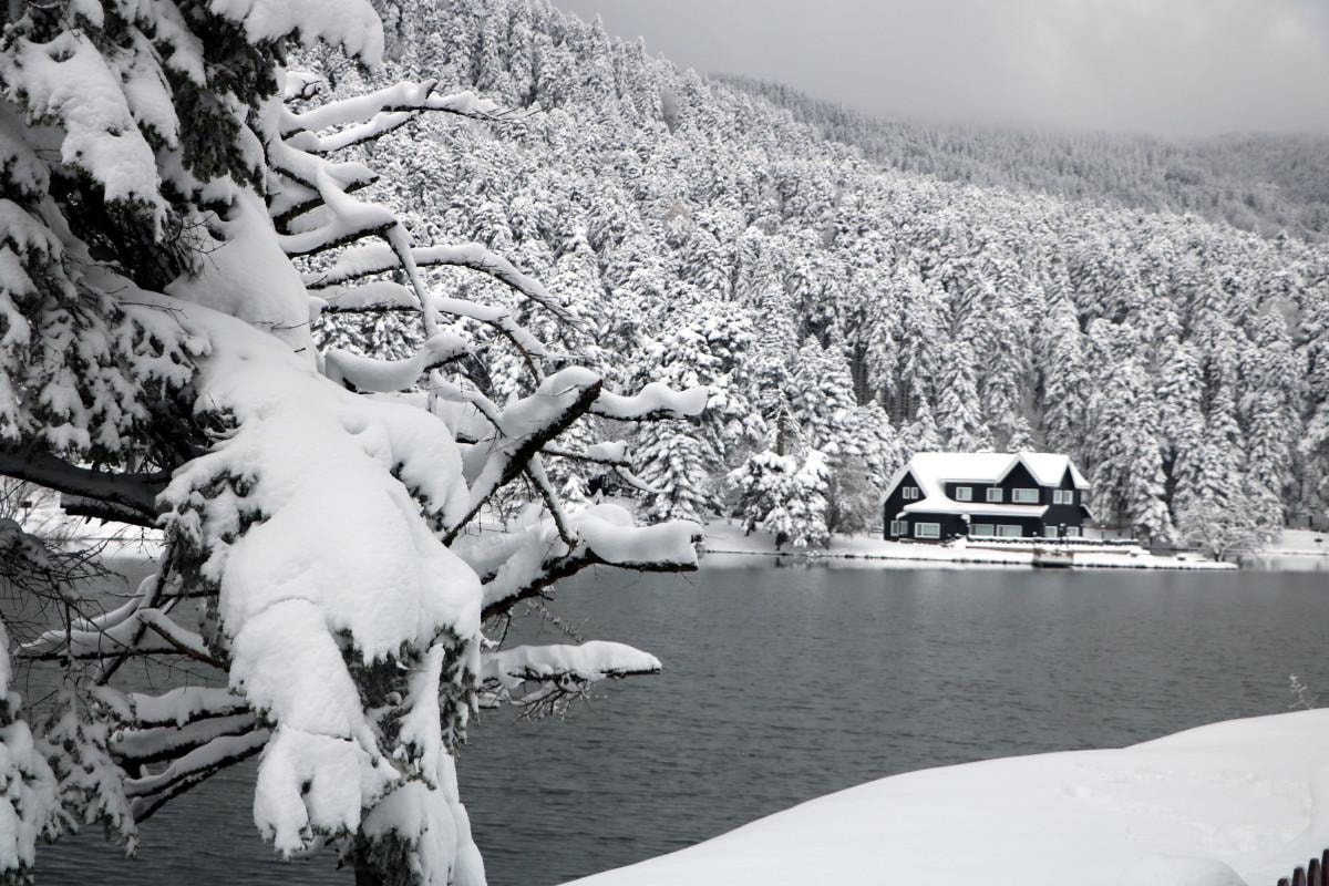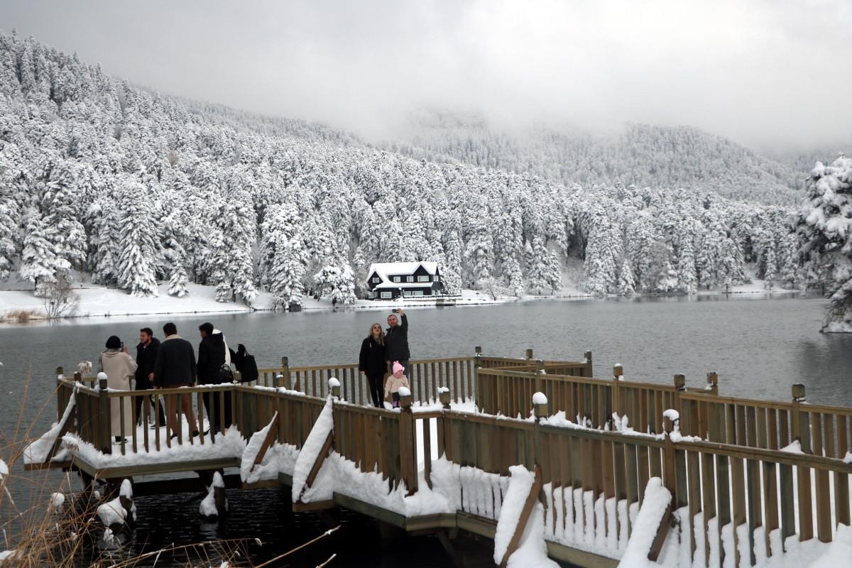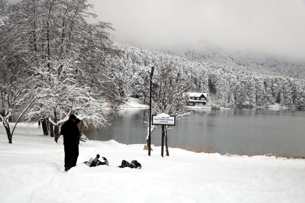 Yılın her mevsimi tatilcilerin ilgi odağı olan Gölcük’ün karla kaplı çam ormanlarının göl ile bütünleşmesi eşsiz manzaralar oluşturdu.