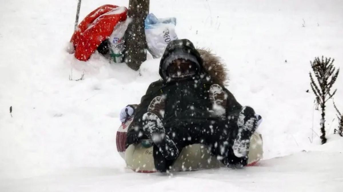 Milli parklar ve tabiat parklarını ziyaret edenler, kiraladıkları ya da satın aldıkları şambreller ile kayarak karın keyfini çıkarıyor.