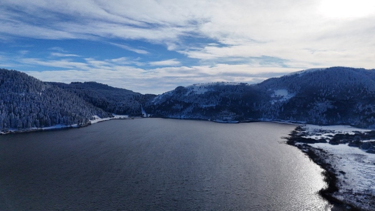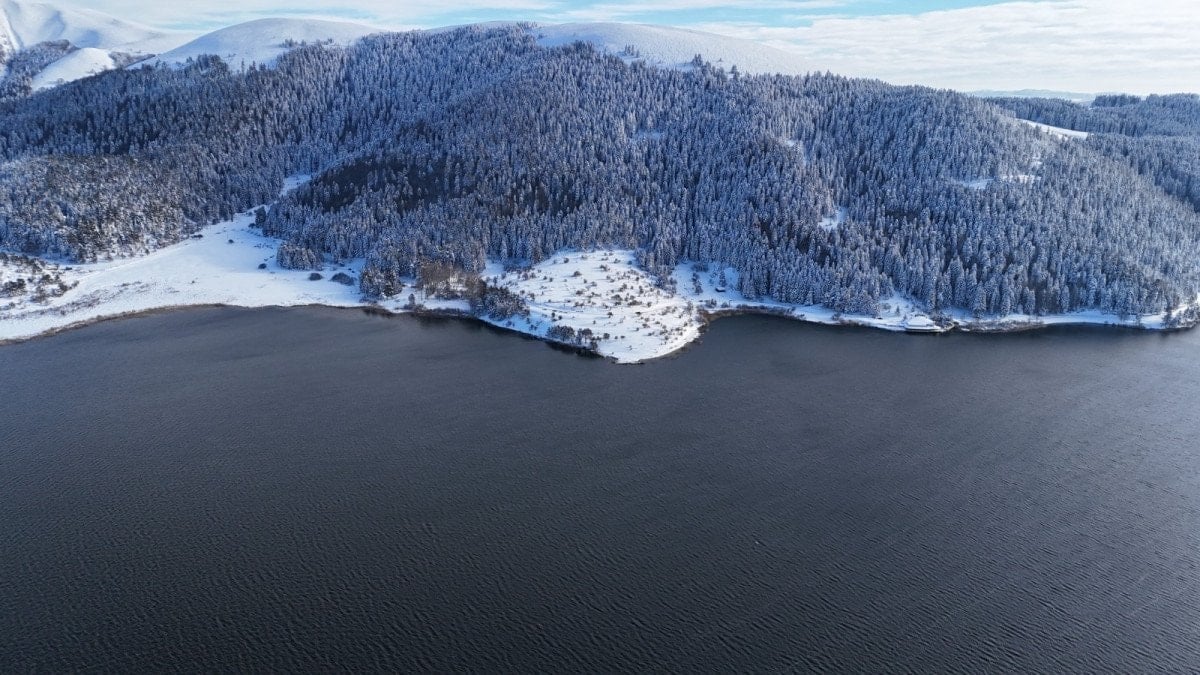 Beyaz örtüye bürünen Abant Gölü Milli Parkı'nın eşsiz manzarası drone ile görüntülendi.