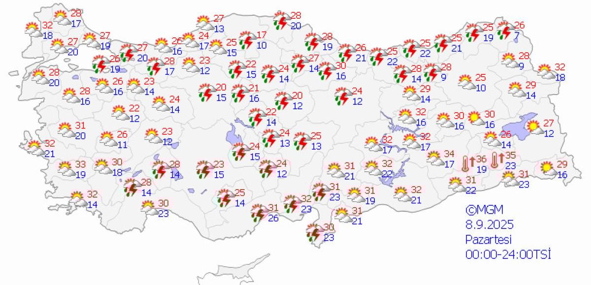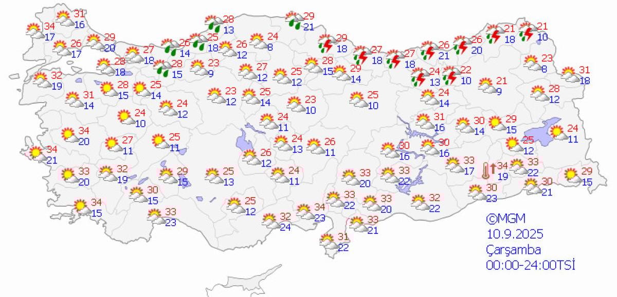 Son tahminlerine göre; yağışların Doğu Karadeniz kıyıları ile Afyonkarahisar, Karabük Çankırı, Kastamonu çevreleri ve Ankara'nın güney ilçelerinde kuvvetli olması bekleniyor.
