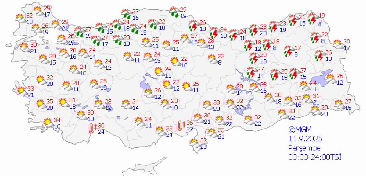 - Doğu Karadeniz, Afyonkarahisar ve Ankara'nın güneyi için kuvvetli yağış uyarısı yapıldı.
