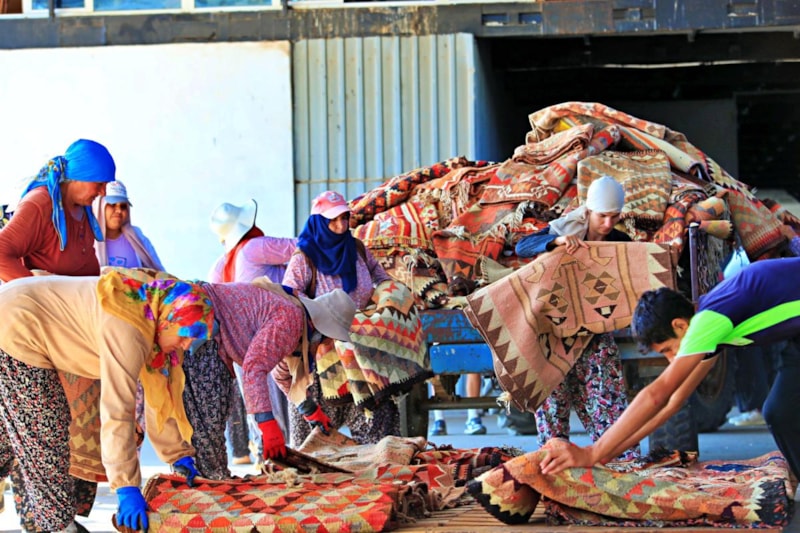 Ağustos ayı sonunda Antalya'nın sıcağı altında yaz mevsimini geçiren ve mikroplardan arınıp, renk tonları oturan halılar toplanıyor.