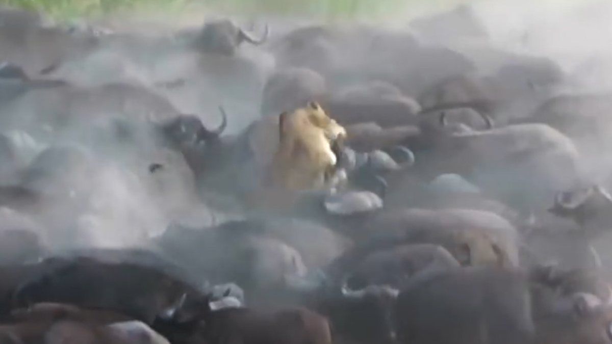 Bufalo sürüsü tek yakaladığı aslanı öldürdü ViDEO