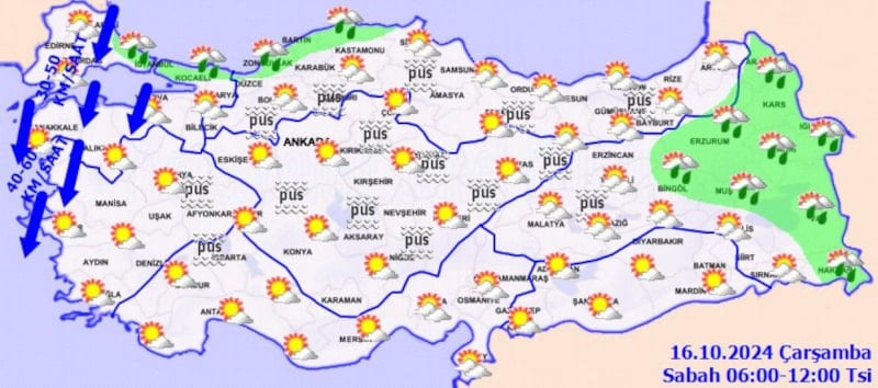 Parçalı ve az bulutlu geçeceği tahmin ediliyor. Rüzgarın, kıyı kesimlerinde kuzeyli yönlerden kuvvetli (30-60 km/sa) olarak esmesi bekleniyor. Sabah ve gece saatlerinde iç kesimlerinde yer yer sis ve pus olayı bekleniyor.