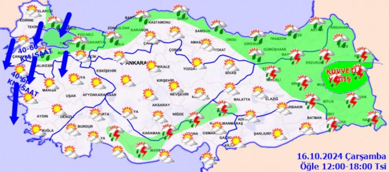 Ayrıca yine yayınlanan hava durumu raporuna; "Ülkemiz genelinin parçalı, yer yer çok bulutlu, Marmara'nın doğusu, Orta Akdeniz’in Toroslar mevkii, Doğu Akdeniz, İç Anadolu'nun doğusu, Karadeniz, Doğu Anadolu(Malatya hariç) ile Güneydoğu Anadolu'nun doğusunun sağanak ve gök gürültülü sağanak yağışlı geçeceği tahmin ediliyor.