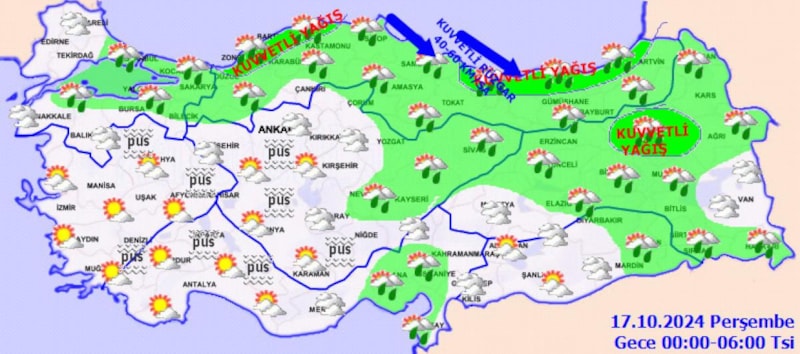 Yağışların, Ağrı çevreleri ile Erzurum’un güney, Muş’un doğu kesimlerinde, gece saatlerinde Doğu Karadeniz kıyıları ile Zonguldak, Bartın, Kastamonu kıyıları, Ordu ve Erzurum çevrelerinde yer yer kuvvetli olması bekleniyor." notu düşüldü.