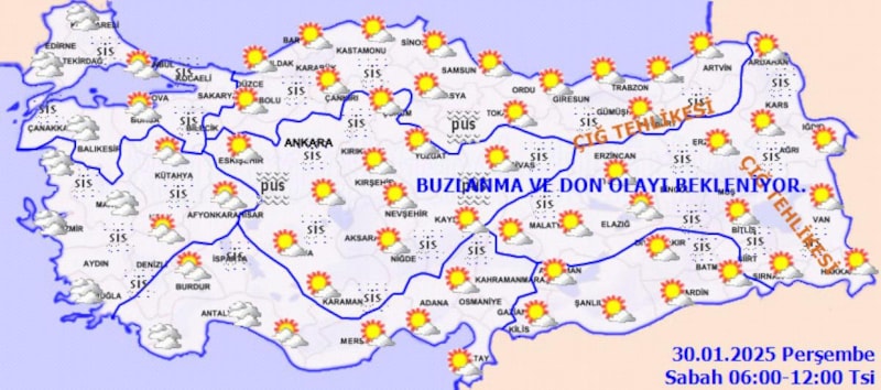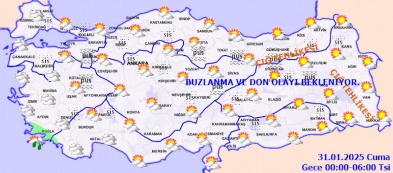 İç ve doğu kesimlerde buzlanma ve don ile birlikte Marmara ile iç ve doğu kesimlerde pus ve yer yer sis bekleniyor.