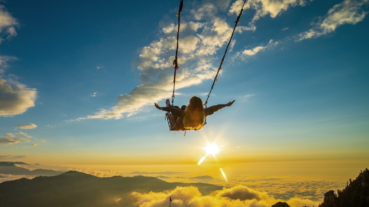 Yaylada sis bulutlarını izlerken salıncakta ve kayık üzerinde fotoğraf çektirmek isteyen ziyaretçiler sıranın kendilerine gelmesini bekliyor.