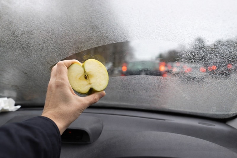 Elmanın kesilmiş yüzeyini ön camın iç kısmına (isteğe bağlı yan camlara da) hafifçe sürün.