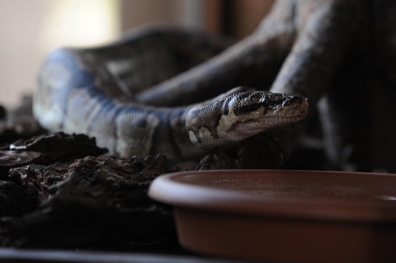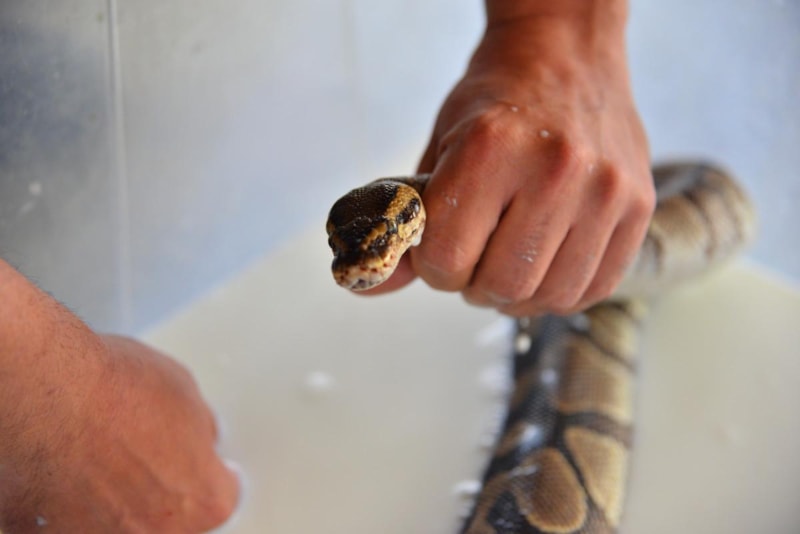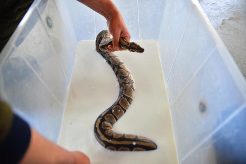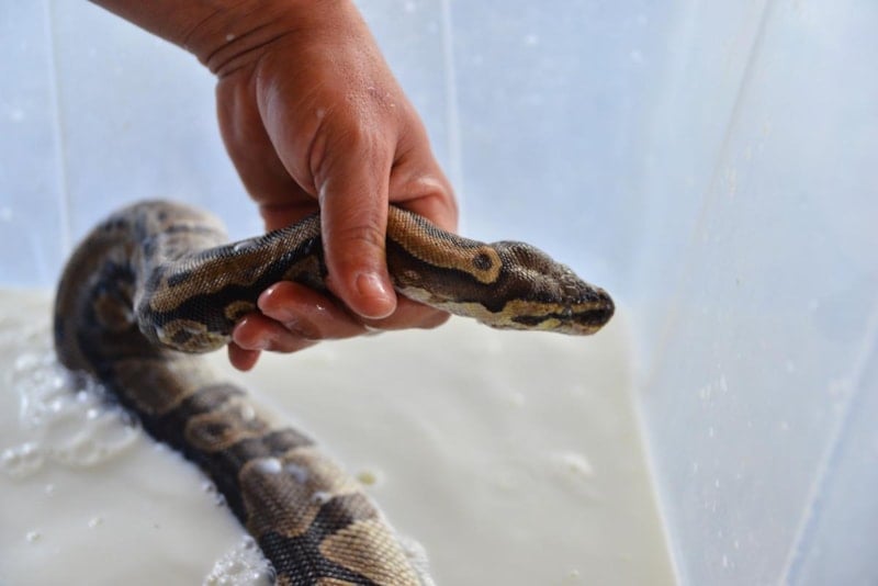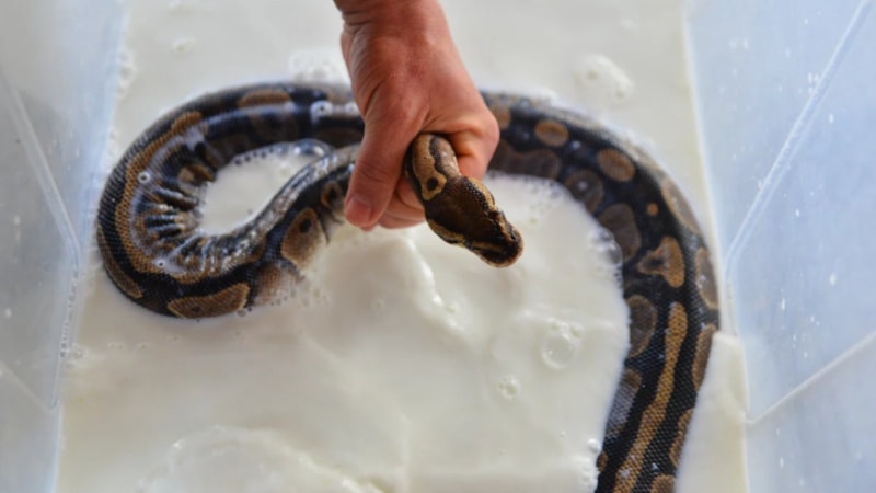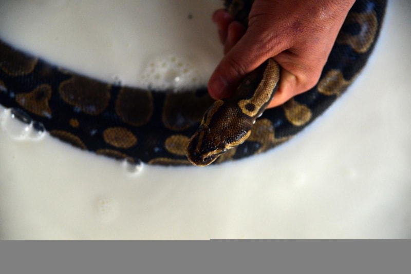 Dünya Doğayı ve Doğal Kaynakları Koruma Birliği'nin (IUCN) nesli tükenme tehlikesi altında bulunan türler arasında gösterdiği kraliyet pitonlarının deri değiştirme sürecini takip eden görevliler, yılanlara haftanın bir günü, deri değiştirmelerine yardımcı olmak için süt banyosu yaptırıyor.