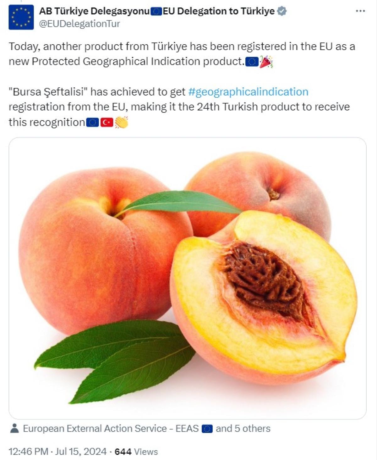 AB Türkiye Delegasyonu'nun açıklamasında “Bugün Türkiye'den bir ürün daha Coğrafi İşaret Korumalı ürün olarak AB'de tescil edildi. ‘Bursa Şeftalisi’, AB'den coğrafi işaret tescili alarak bunu alan 24. Türk ürünü oldu” denildi.