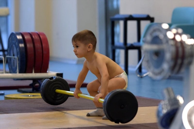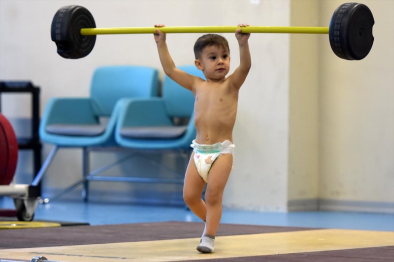 Türk sporunun efsanelerinden Naim Süleymanoğlu'nun adını taşıyan tesiste serbestçe dolaşan ve sporcularla iletişim halinde olan küçük Mert'in altındaki bezle yaptığı kaldırışlar ve sonrasında yaşadığı sevinç herkesi eğlendiriyor.
