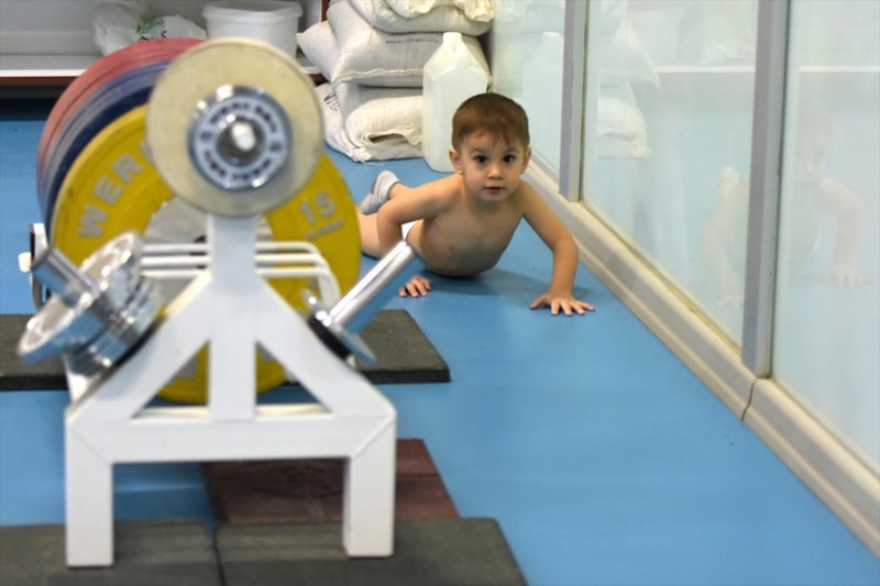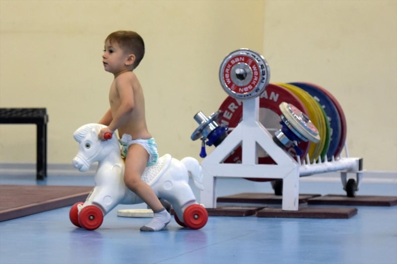Bursa'da eski milli halterciler Ümmühan Uçar Bilgin ve Erol Bilgin'in 2 yaşındaki çocukları Mert, antrenör annesiyle geldiği salonda altındaki beziyle paspas sopasından halterini kaldırıyor.