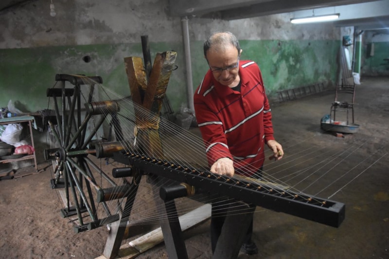 Ham ipeği temizlenmiş ve parlatılmış kuzu kemiğine bağlayan zanaatkar, ipliğin bükülmesi ve düzeltilmesi aşamasında tezgahın başında adeta mekik dokuyor.