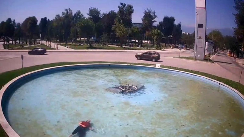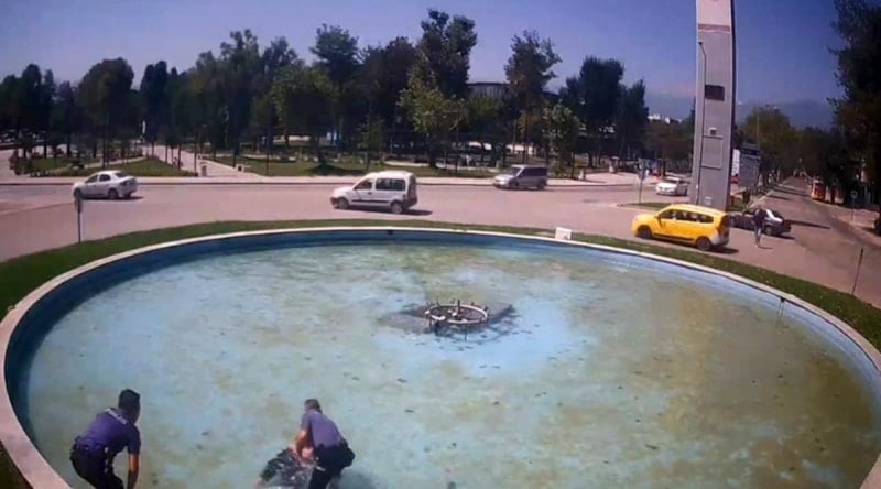 İnegöl ilçesinde bulunan süs havuzuna düşen alkollü şahıs, polis ekiplerinin hızlı müdahalesiyle boğulmaktan son anda kurtarıldı. Şahsın boğulmak üzere olduğu ve polis ekiplerinin kurtardığı anlar bir iş yerinin güvenlik kamerasına saniye saniye yansıdı.
