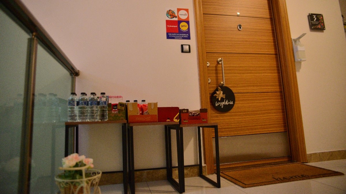 Bursa'daki aile, restoran ve marketlerden sipariş ettikleri ürünleri getiren kuryeler için daire kapılarının önüne ikram masası kurdu.