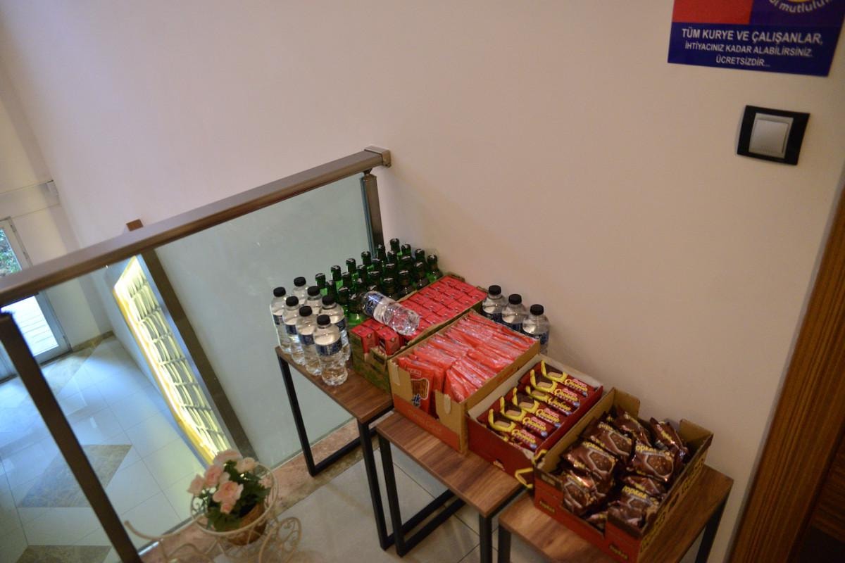 Nilüfer ilçesi Balat Mahallesi'ndeki bir sitede yaşayan aile, internet üzerinden sipariş verdikleri yiyecek, içecek ve market ürünlerini getiren kuryeler için ikram masası oluşturdu.
