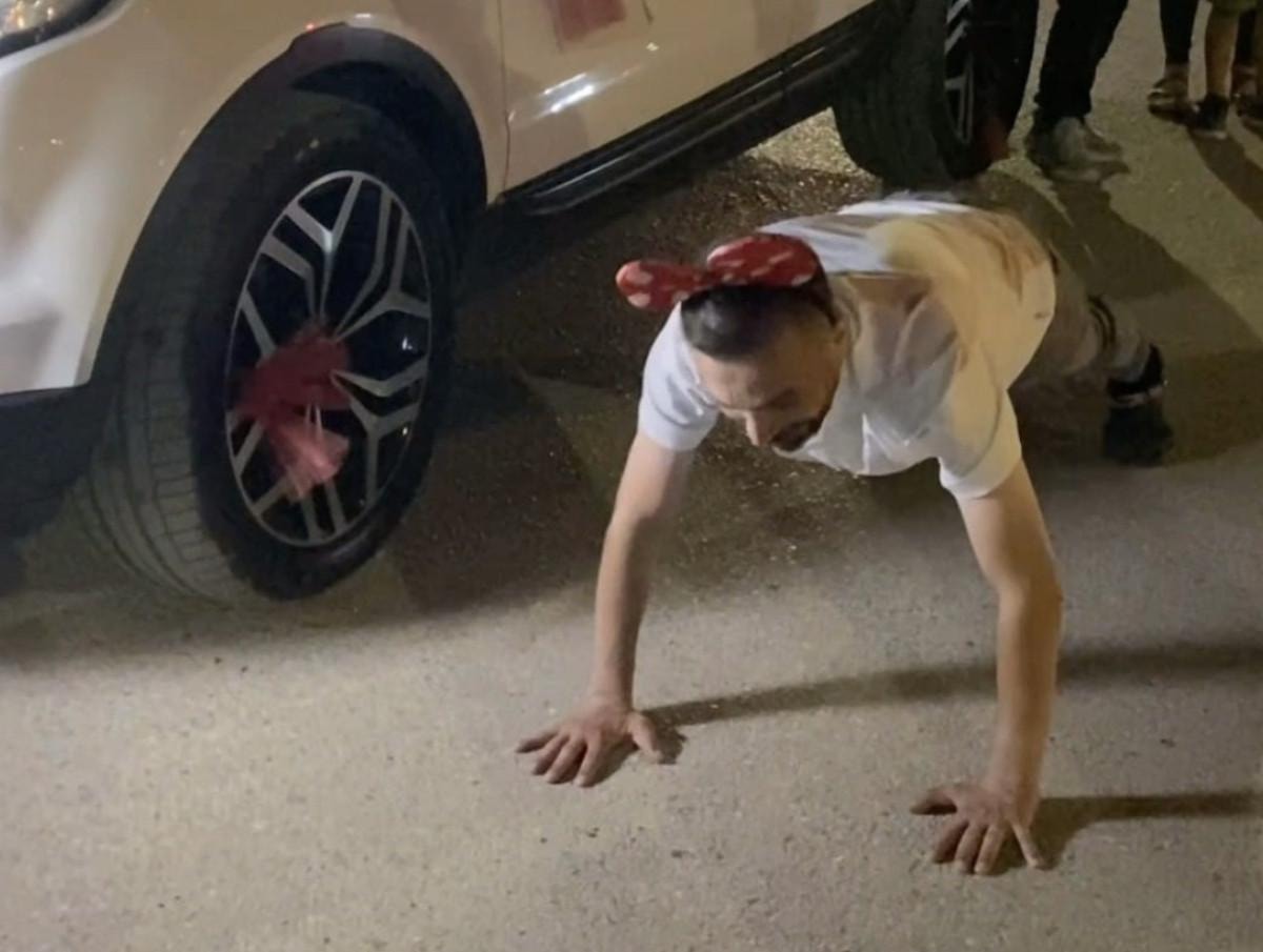 Damat 10 kez şınav çekip ördek yürüyüşü yaptı.