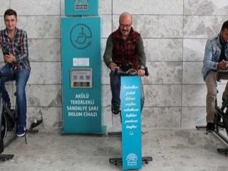 Halk Evi binasının önüne kurulan pedallı sarj aletleri hem belediyeye gelen vatandaşlara spor yapma imkanı sunuyor hem de enerji tasarrufu sağlıyor.