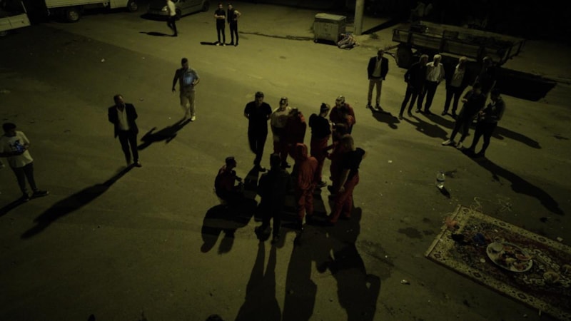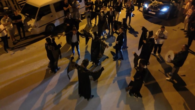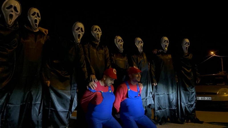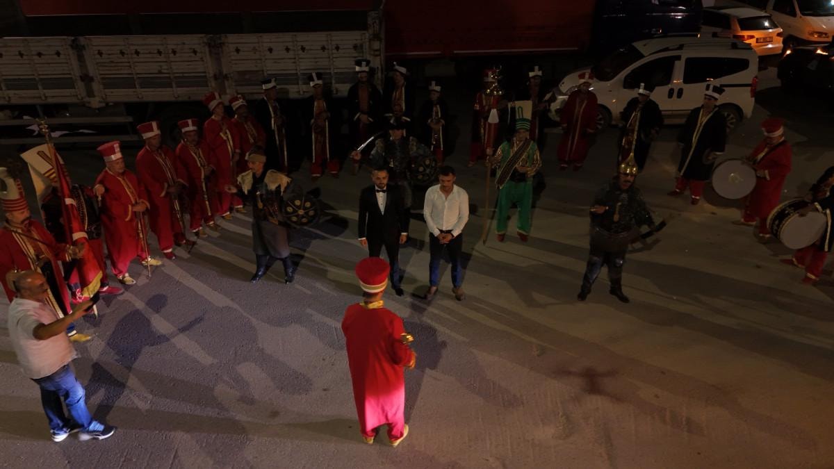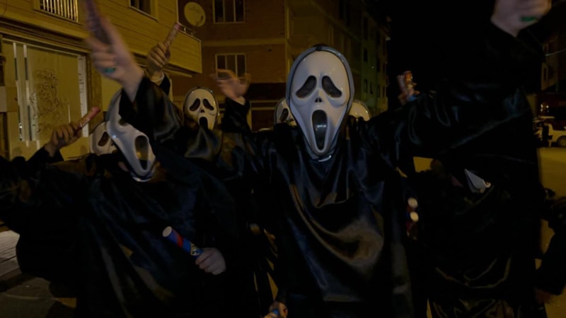 Düğün bitimi kolları sıvayan grup, damadı mahalle girişinde mehteran takımı ile karşıladı. Mehter eşliğinde yürüyen damadın karşısına bu sefer "Çığlık Maskesi" takan bir grup çıktı.