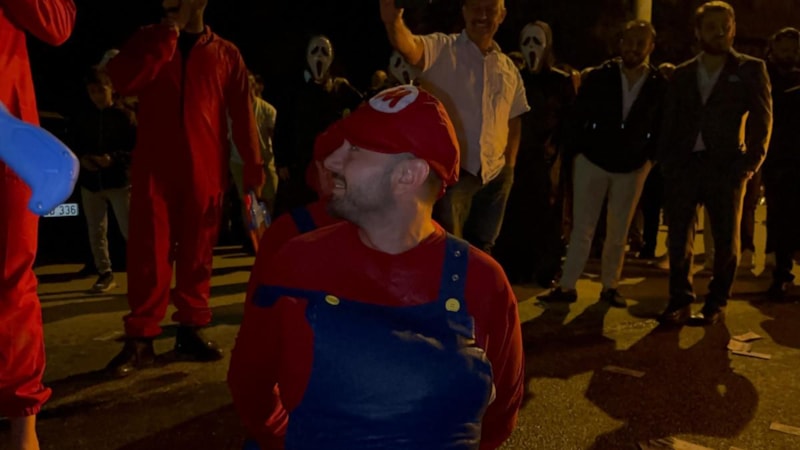 "Mario" kostümü giyen damat ve sağdıç, bu sefer "La Casa De Papel" adlı dizide rol alan oyuncuların kostümlerini giyen başka bir grup ile karşılaştı.