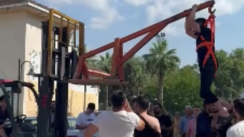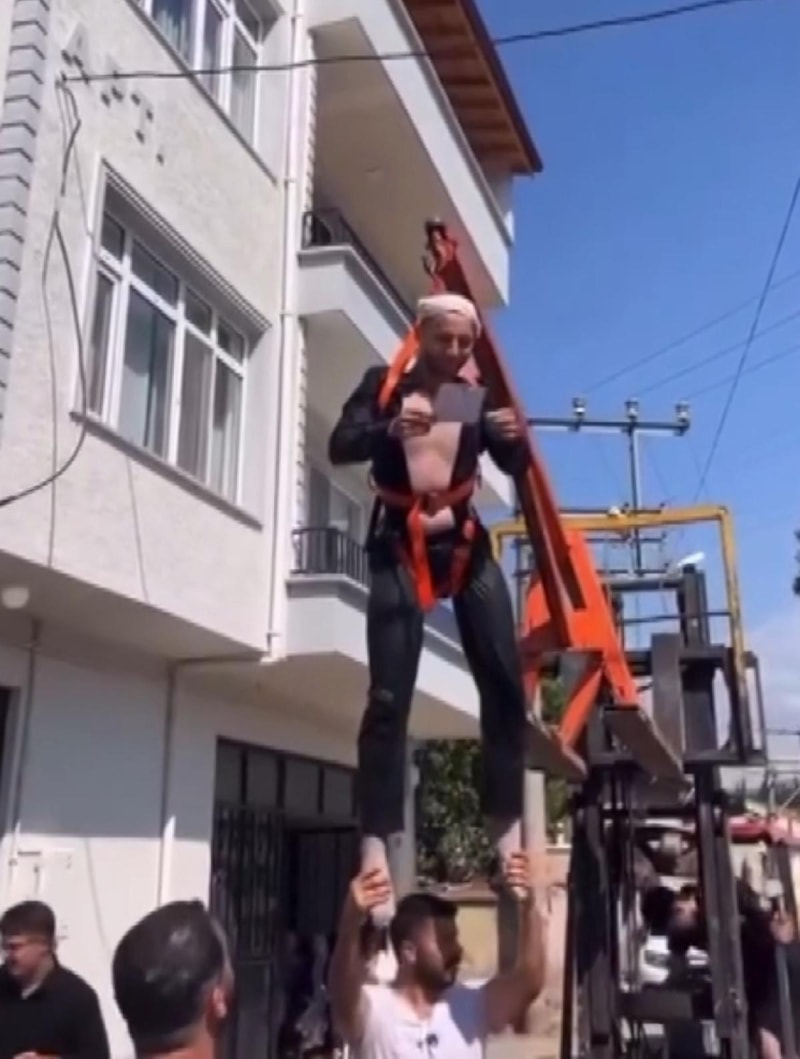 Gelin alma sırasında damat Hasan Bafralı'nın arkadaşları, önce damadı forklifte astı, ardından bahçe hortumu ile yıkayıp su dolu bidona soktular.
