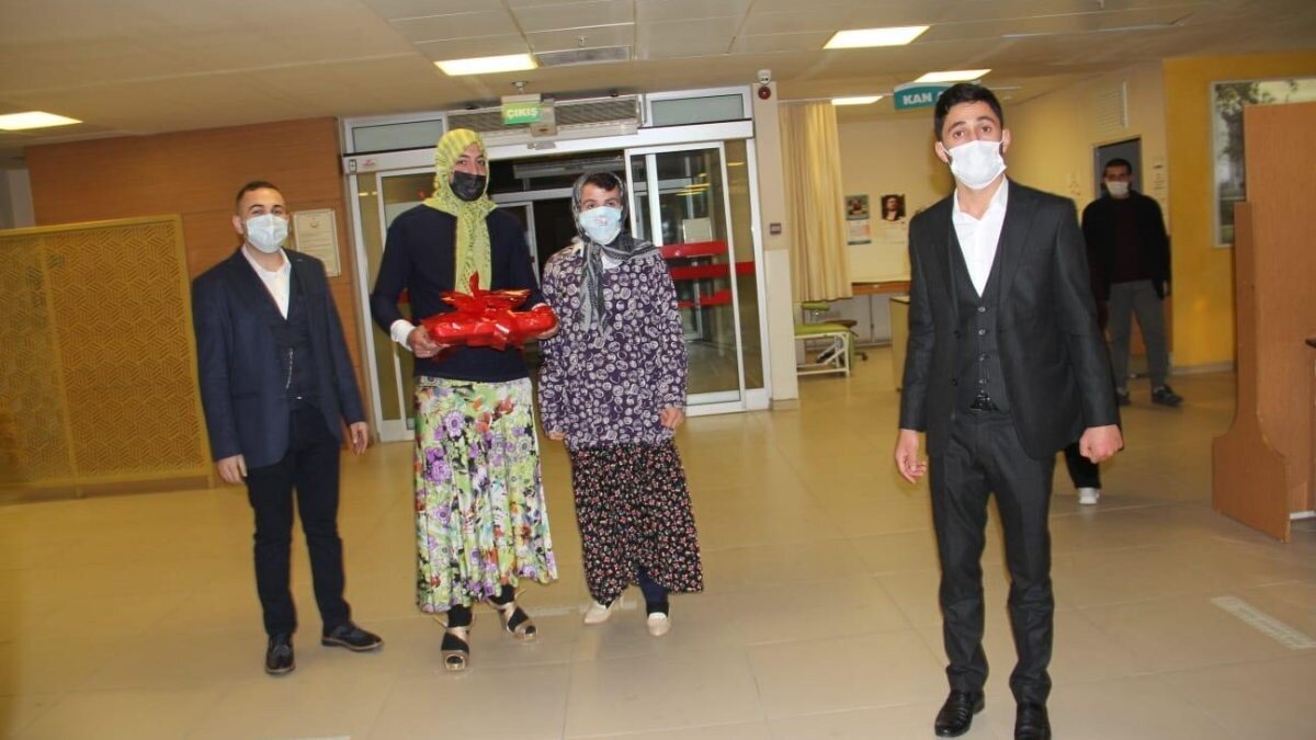 Bir müddet sağlık çalışanları ve vatandaşlar arasında kadın kıyafetleri ile yürüyen damat Sedat Güzel, daha sonra sağlık çalışanlarına ikramlarda bulundu.