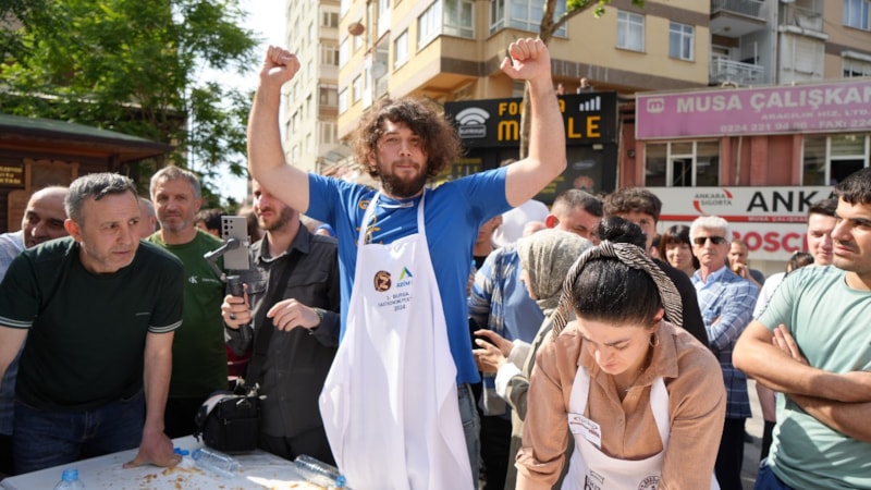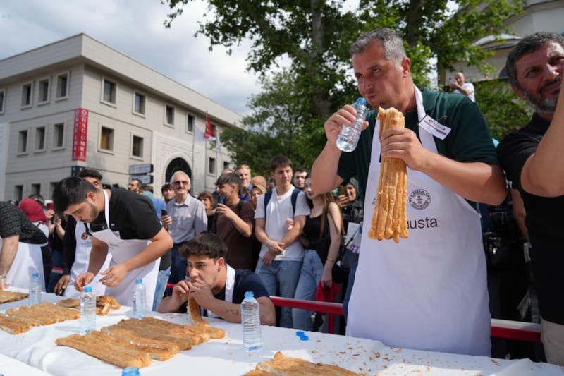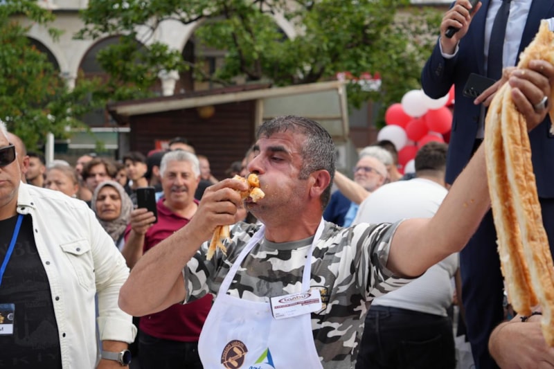 Yarışmaya katılan onlarca kişi, belirlenen 5.5 dakikada sürede en fazla böreği yemek için kıyasıya mücadele etti.