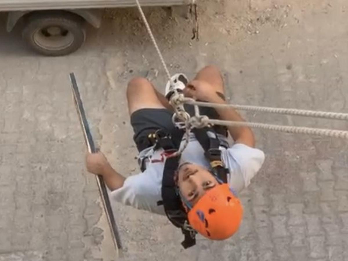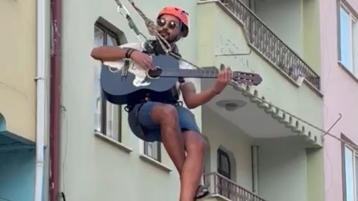 Emniyet kemerini takıp, gitar çalarak şarkı söyleyip 3'üncü kattan aşağı inen ve halat üzerinde öğrencilik yıllarının geçtiği eve veda eden Baş'ı, komşuları ilgiyle izleyip, cep telefonu kamerasıyla görüntüledi.