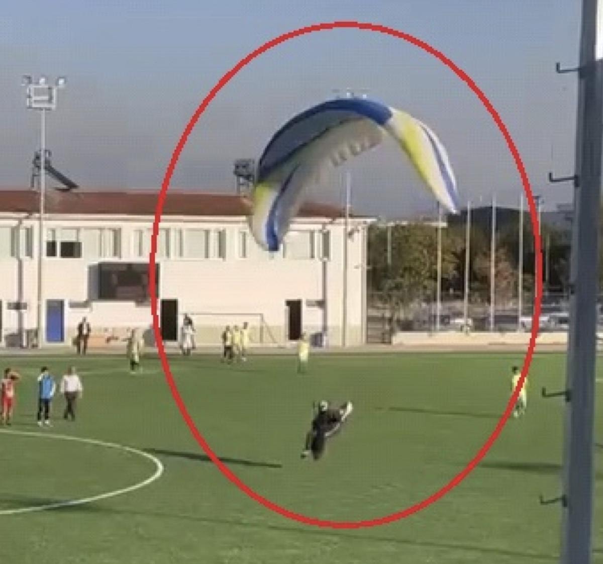 Uludağ eteklerinden paraşütle süzülerek, futbol sahasına inen Adem Keskin, “Uludağ’dan uçuş yaptık. Evime yakın olduğu için, top sahasına iniş yapmak zorunda kaldım. Güzel bir uçuştu, iniş yaptım. Sahada futbolcular top oynuyormuş.