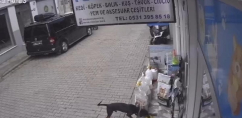 Görüntülerde her sabah dükkanını açarken beslediği kedi ve köpeklerin bir birine saldırmadan tartıştığını, bir köpeğin ise kediyi kıskanıp, dolu mama kabını alarak karşıya geçtiğini gördü.