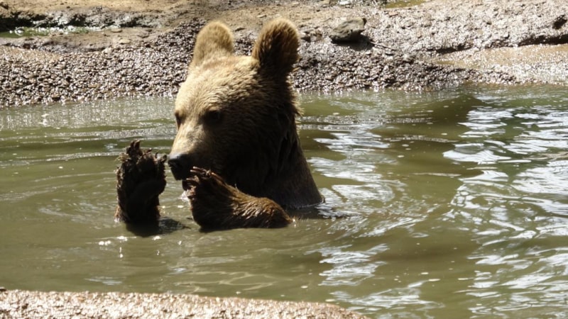 Ovakorusu Ayı Barınağı’nda yaşamlarını sürdüren 7’si yavru 76 bozayı, bunaltıcı sıcaklarda havuza girip soğutulmuş meyve yiyerek serinliyor.