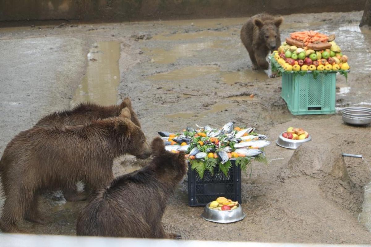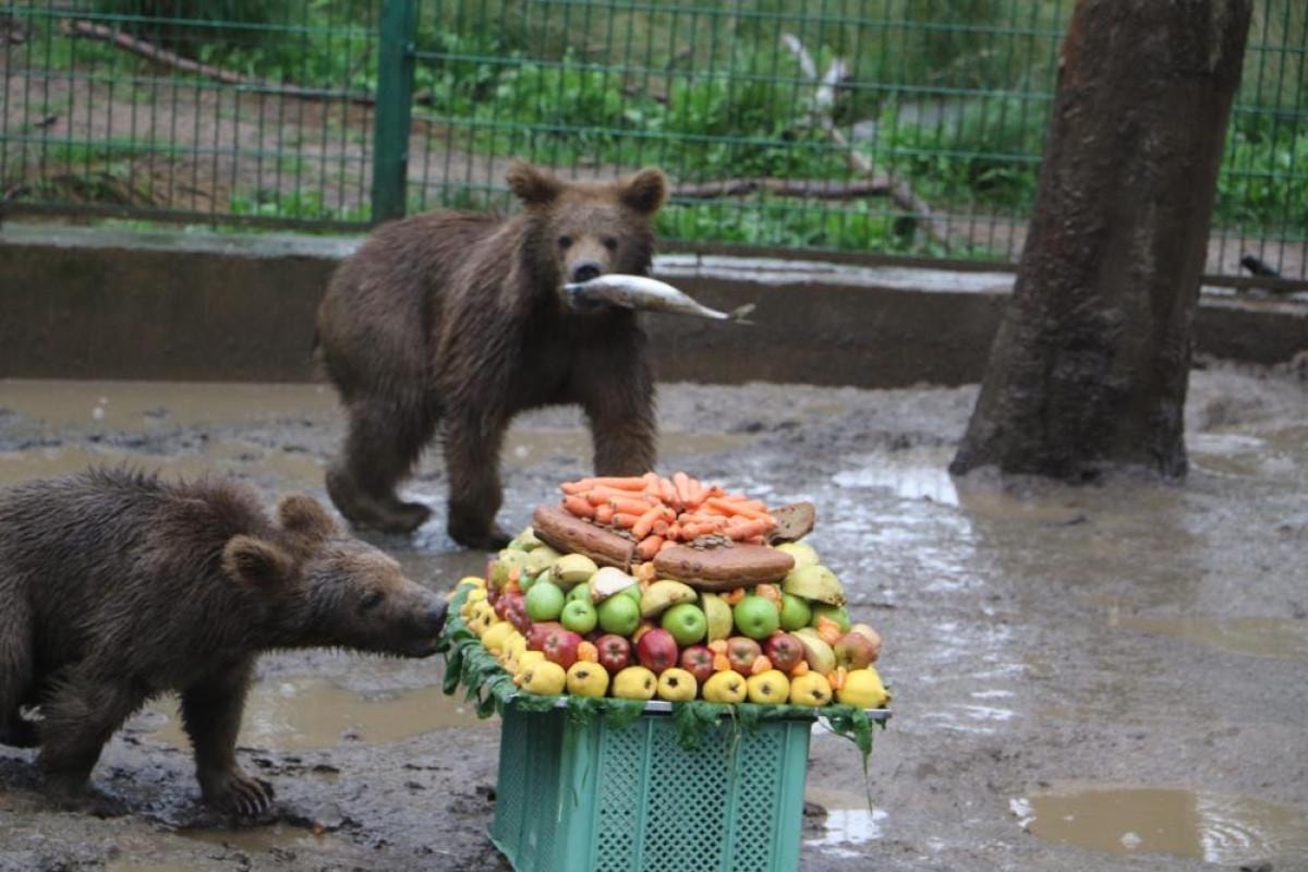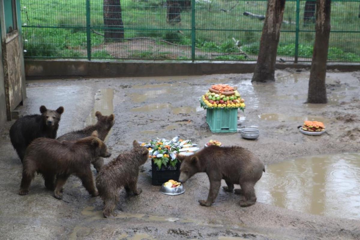 Türkiye'nin ilk ve tek ayı barınağı Bursa'nın Karacabey ilçesindeki Ovakorusu Ayı Yaşam Merkezi'nde tedavi süreçleri tamamlanıp ilk yaşlarına sağlıklı bir şekilde giren yavru ayılar için ballı meyveli ve balıklı sebzeli 3 çeşit doğum günü pastası yapıldı.