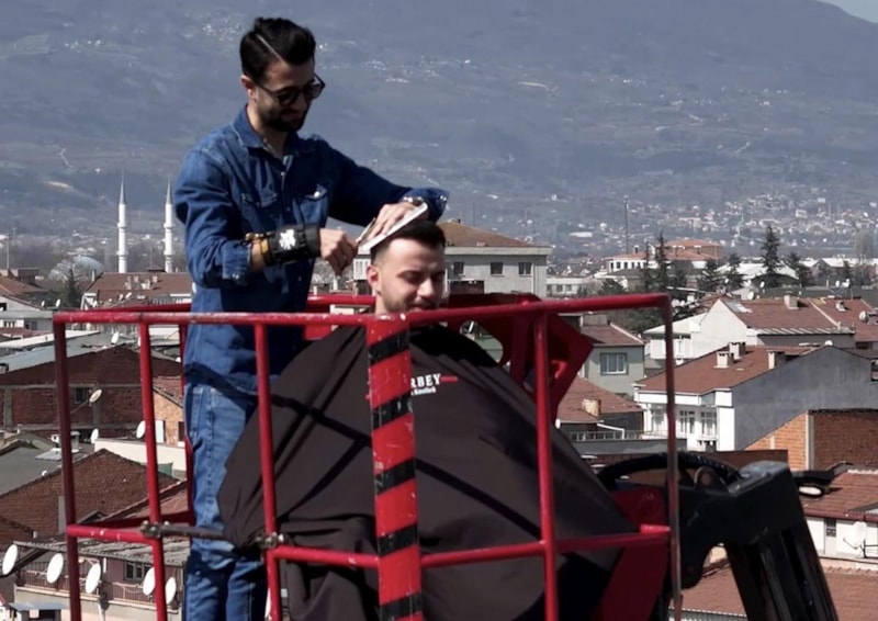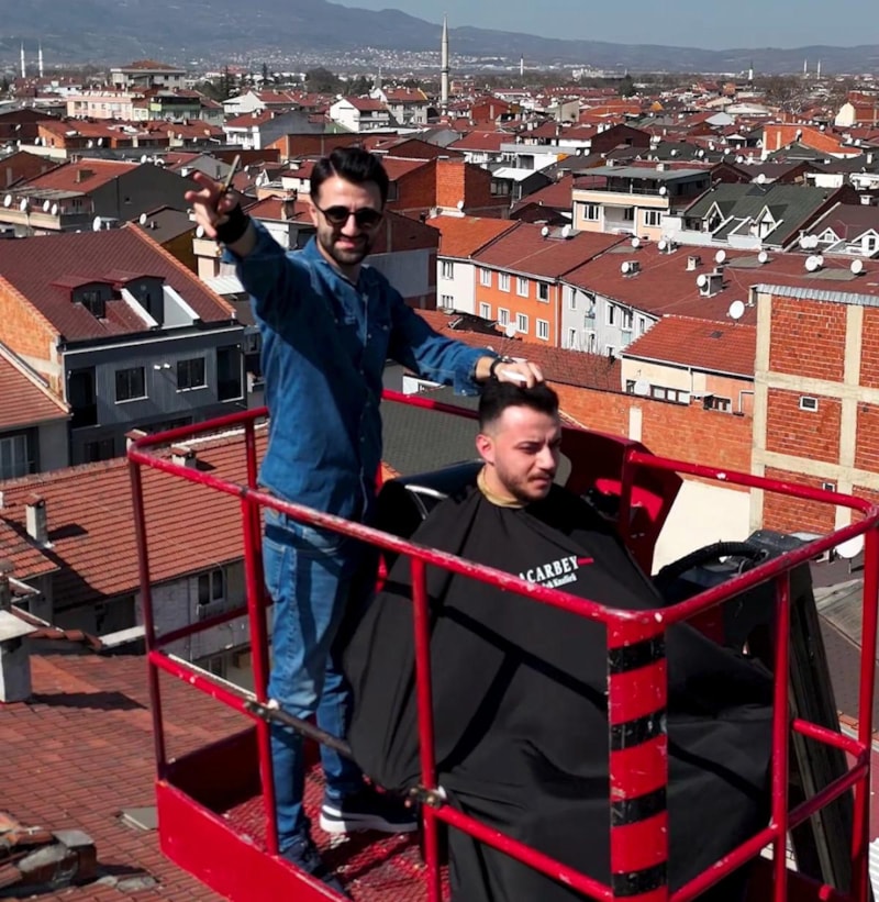 İnegöl ilçesinde bir erkek kuaförü, müşterisini kiraladığı vincin sepetine bindirerek 26 metre yükseklikte tıraş etti. O anlara ait görüntüler büyük ilgi gördü.