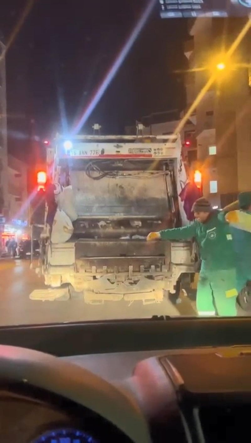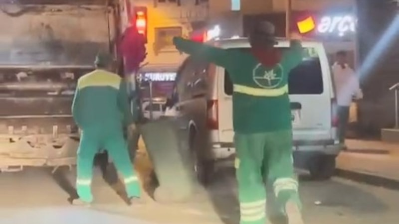 Belediye görevlilerinden Murat Altınışık, Emek Mahallesi'nde çöp topladığı sırada kamyonun arkasındaki araçtan gelen horon ile birlikte oynamaya başladı.