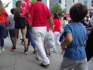 19 Mayıs Atatürk'ü Anma Gençlik ve Spor Bayramı sebebiyle düzenlenen yürüyüşe katılan yaşlı bir adam, beraberinde getirdiği 3 yaşındaki torununun beline "kaybolmasın" diye ip bağladı.