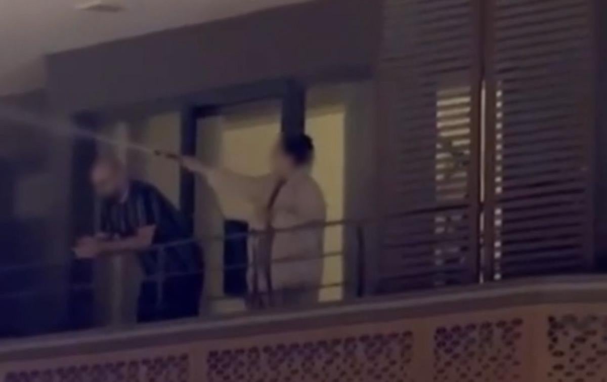 Duruma sinirlenen ev sahipleri, araçların üzerine balkondan su sıktı.