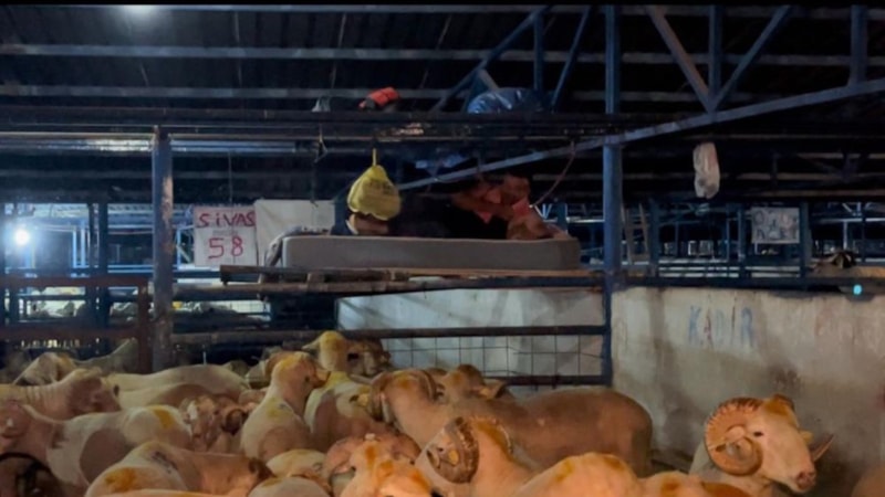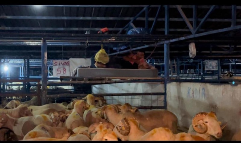 İsabey'deki hayvan pazarına farklı illerden kurbanlık getiren satıcılar, geceleyin hayvanlarla koyun koyuna yatıyor.