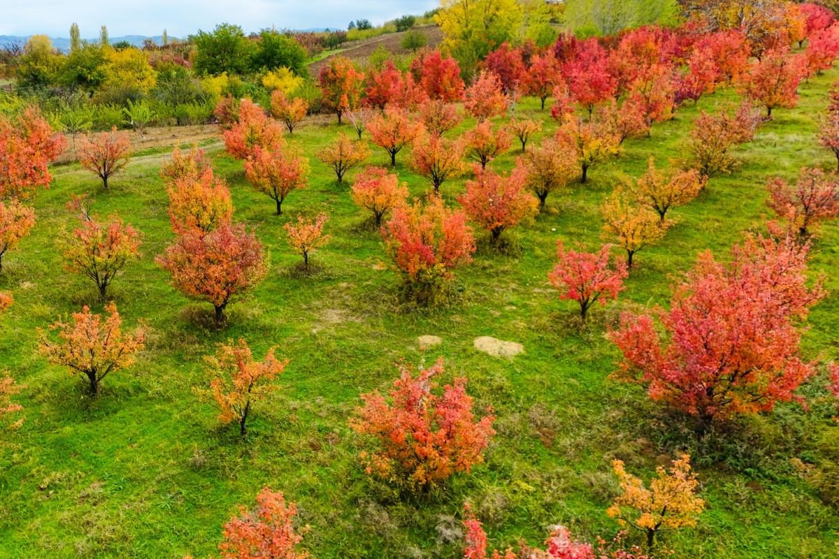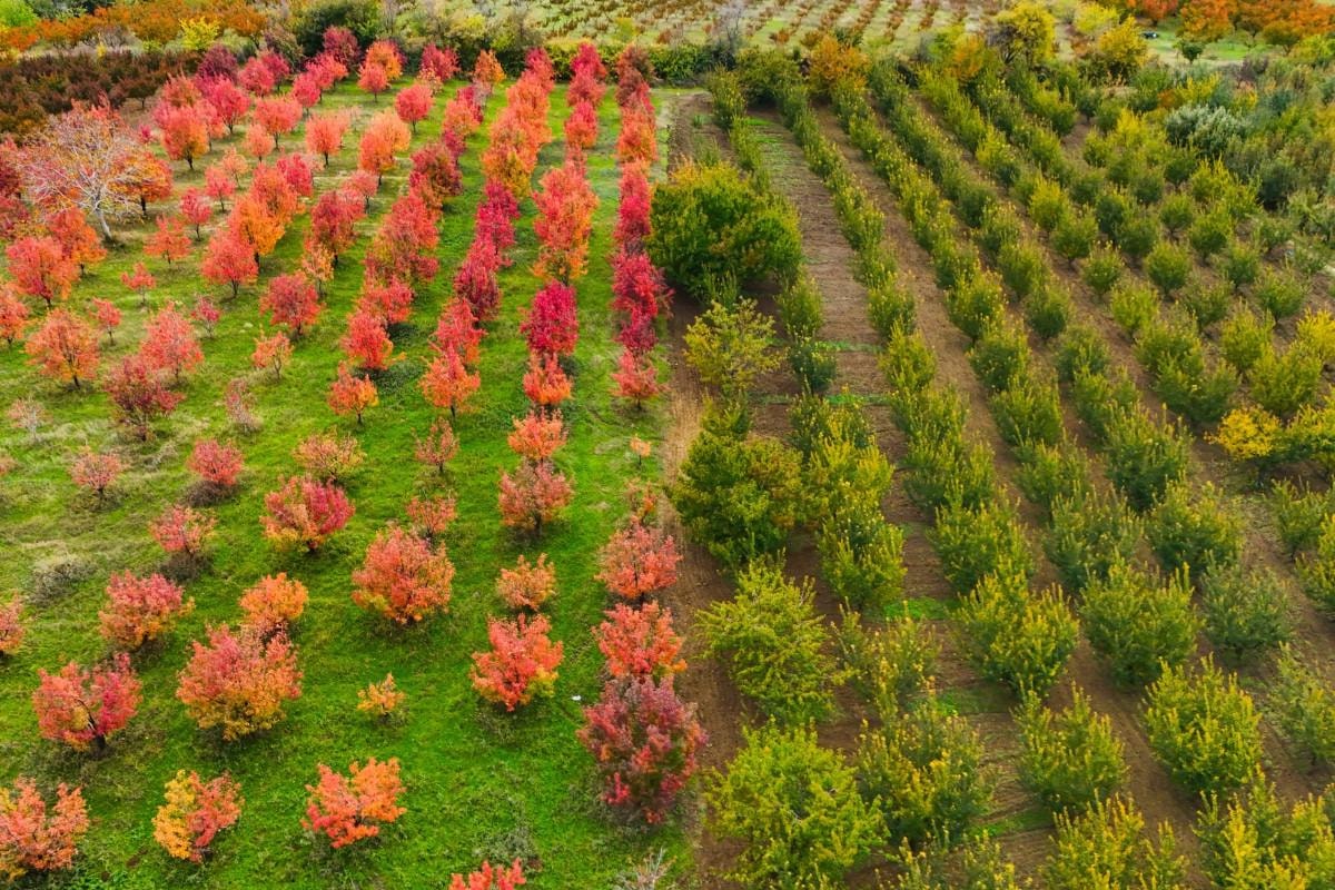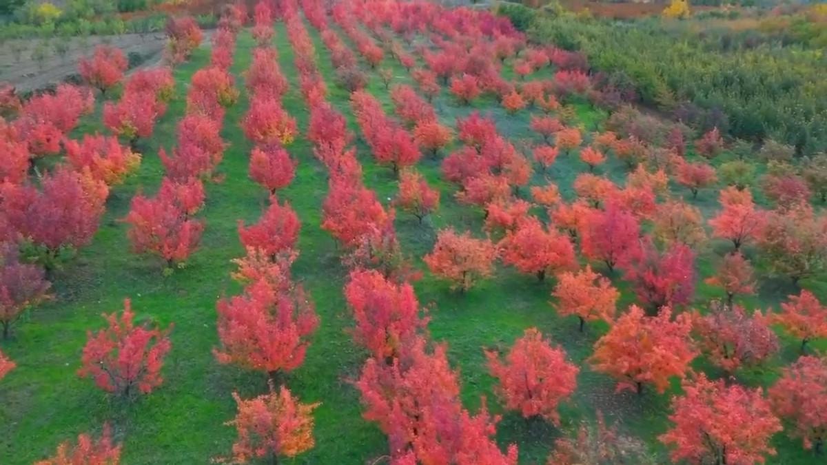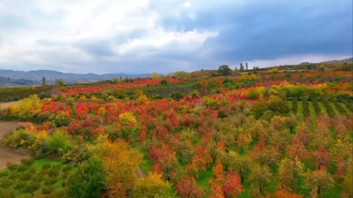 Santa Maria cinsi armut, şeftali ve elma bahçelerindeki renk cümbüşü, drone'la havadan görüntülendi.
