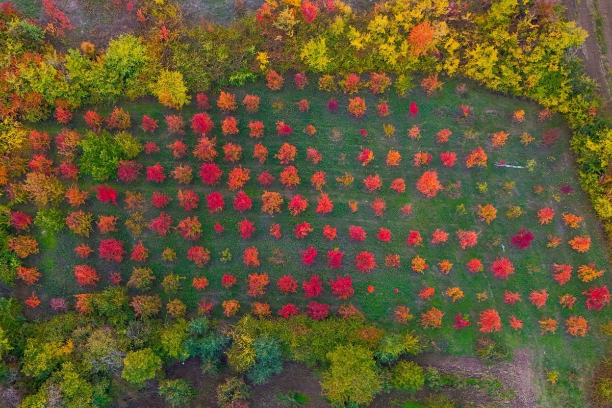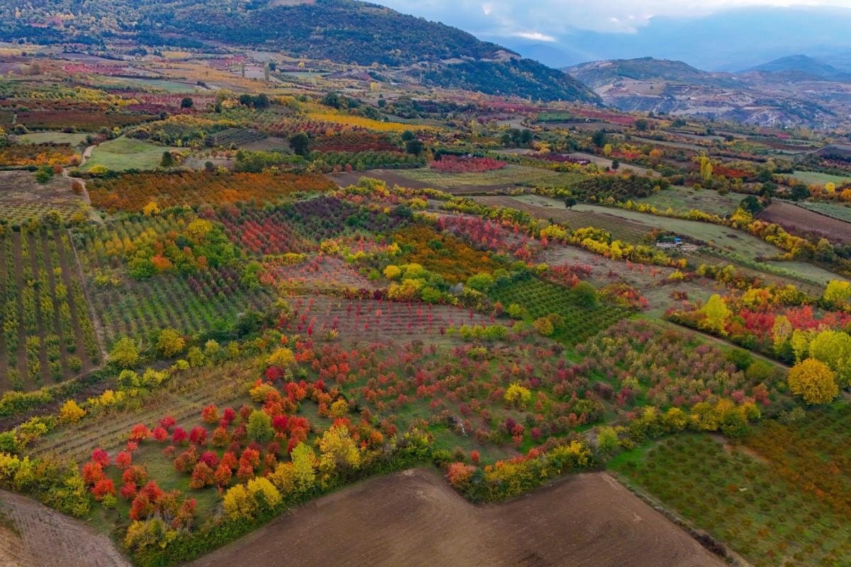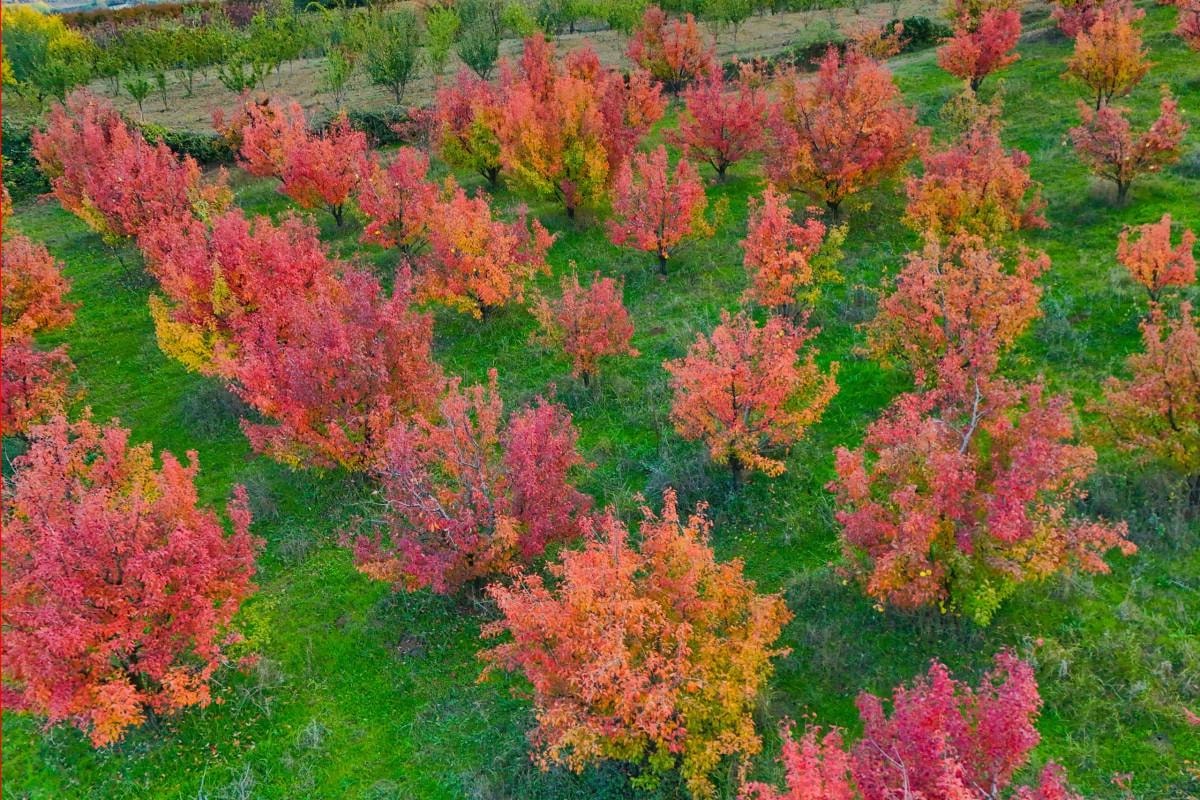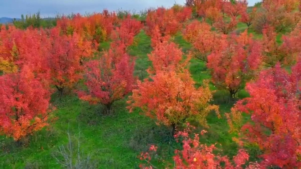 Santa Maria cinsi armut, şeftali ve elma bahçelerindeki renk cümbüşü, drone'la havadan görüntülendi.