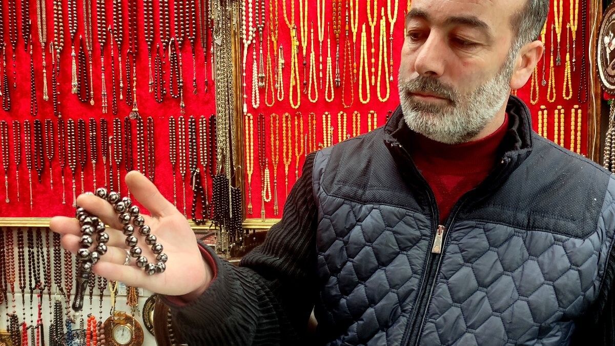 Temel Cengiz'in işyerindeki tespih çeşitleri 50 liradan 10 bin liraya kadar değişiyor.