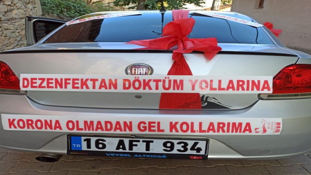Düğün arabalarını süsleyen damat Osman Demirkol, aracın üzerine, “Dezenfektan döktüm yollarına korona olmadan gel kollarıma” yazısı yazarak gelin almaya gitti.