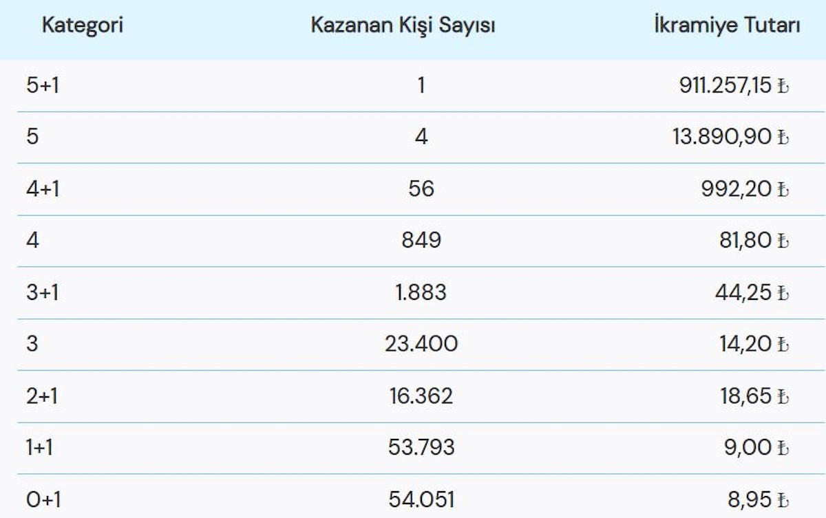 5+1 kategorisinde tüm numaraları doğru bilen 1 şanslı vatandaş 911.257,15 TL'lik ödülün sahibi oldu.