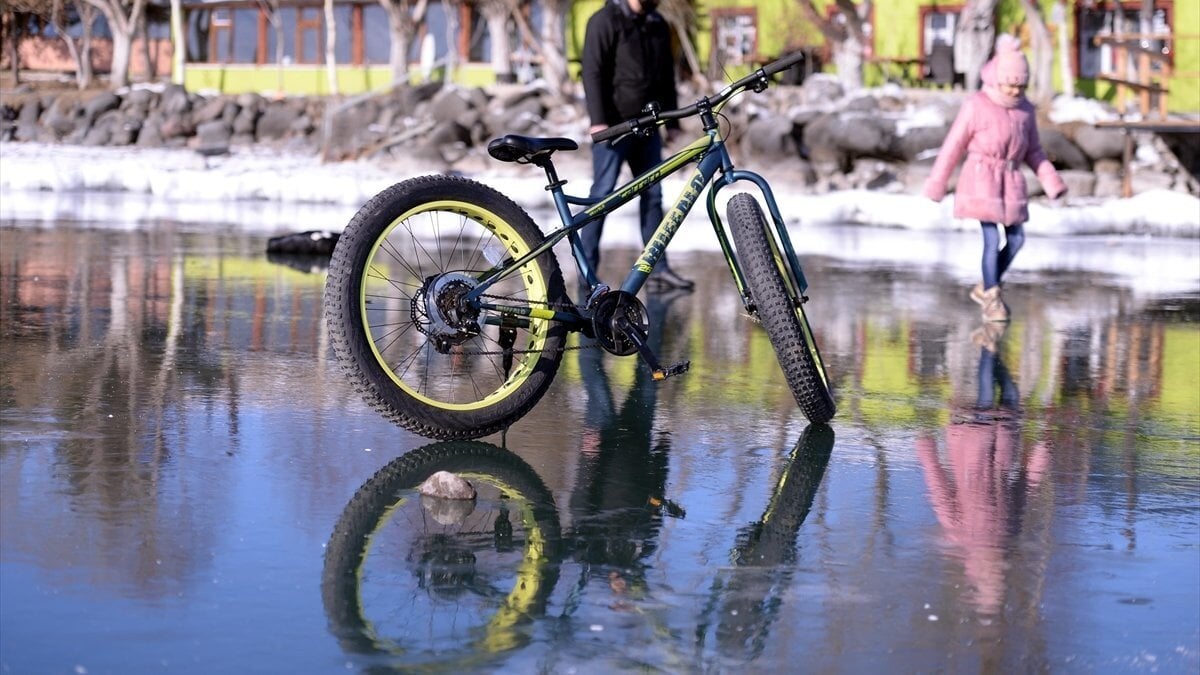 Kaymakamlık desteğinde temin ettiği bisikletlere özel lastikler takan lokanta işletmecisi Atalayan Uzunkaya, kiralama usulüyle, bölgeye gelen turistlere buz üzerinde pedal çevirme imkanı sunuyor.