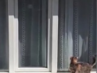 Görüntülerde, kendini kurtarmak için çıkış yolu alayan kedinin daracık mermerde sağa, sola gittiği görülüyor. Düşme tehlikesiyle burun buruna gelen kediyi kayda çeken adam ''Eyvah ayağı kayacak!'' diye tepki verirken, kedinin camı ittirerek açmayı başarmasıyla herkes rahat bir nefes alıyor.