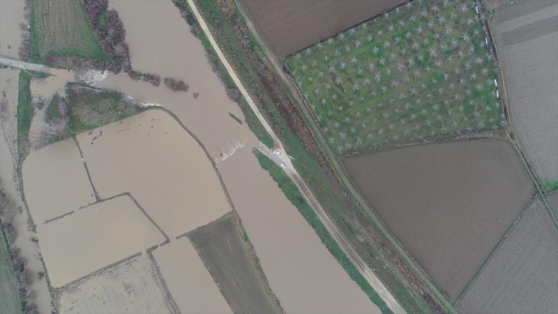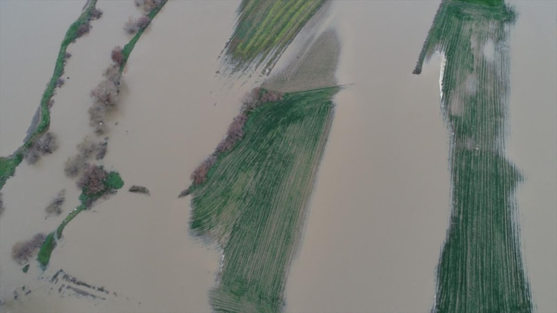 Taşkın nedeniyle su altında kalan buğday ve arpa ekili tarım arazileri, drone kullanılarak görüntülendi.