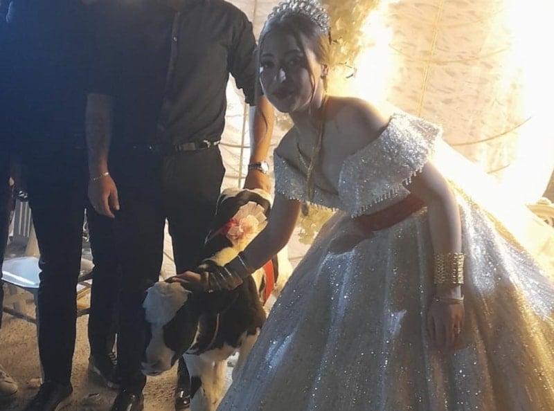 Çiftin arkadaşlarından Hakkı Eren, geline takı töreninde buzağı hediye etti.